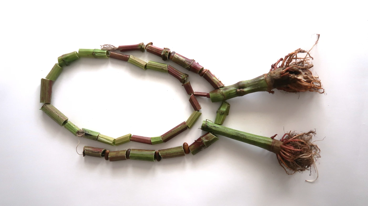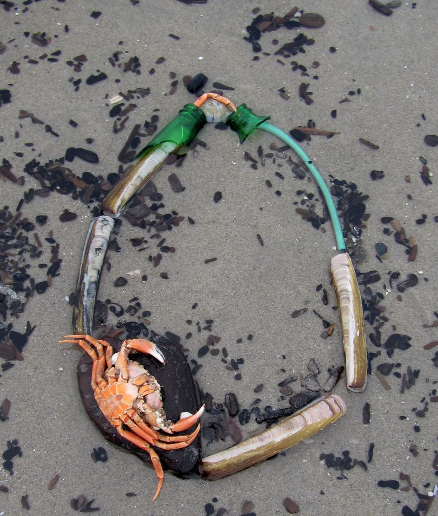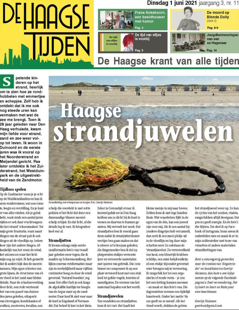 Van wandelen en strandjutten kom ik tot rust. Het haalt het kleine meisje in mij naar boven. Zelden kom ik met lege handen thuis. Wat waardeloos lijkt in de ogen van de één, kan een juweel zijn voor mij. Als ik een aantal mooie dingetjes heb verzameld, dan zoek ik een mooi plekje uit in de vloedlijn en leg daar mijn schatten neer. Zo ontstaan de ‘strandjuwelen’. De verweerdheid van hout, een kleurrijk krabbenschildje, een mini babykwalletje of een stukje bijzonder gevormd wier brengen mij in vervoering. Ik rangschik het tot een organische of ronde vorm – je zou het een ketting kunnen noemen – en maak er dan foto’s van. Die dagvondsten vormen een tijdelijk kunstwerk. Onder het motto ‘de zee geeft en ze neemt’. Als het vloed wordt, slokken de golven het strandjuweel weer op. Zo kan de cyclus van het zoeken, vinden, rangschikken altijd doorgaan. Dat proces geeft energie. En de foto’s die blijven. Die deel ik op Facebook of Instagram. Soms neem ik onderdelen mee en maak ik er in mijn zolderatelier met touw van visnetten of andere materialen strandkettingen van.
