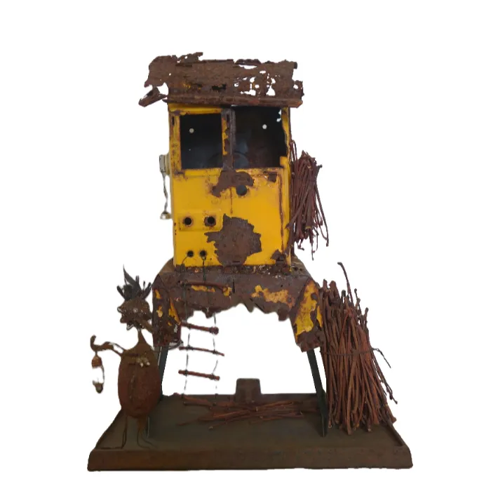 Dat effect heb je ook langs de afgekalfde kustlijn ter hoogte van de Argus mast op de zandmotor. Daar hoef ik niet voor naar de kust in Engeland of Normandië. Dat beleef ik hier in het klein. Zeker in Coronatijd ervaar ik hoeveel geluk we in Den Haag hebben om zo dicht bij de kust te wonen en daarvan te kunnen genieten. Mij verveelt het nooit. Dat strandjutten ben ik vooral gaan doen nadat ik straatjutterskunstwerkjes ben gaan maken en dat is alweer zo’n tien jaar geleden. Als dingenzoeker ben ik dol op platgereden stukjes verroeste ijzer en verweerde materialen met sporen van gebruik. Die combineer en componeer ik op een plaat verweerd hout met een stuk lood tot gekke vogels, beesten of mensfiguren. De vormen van het materiaal bepalen wat het wordt.
