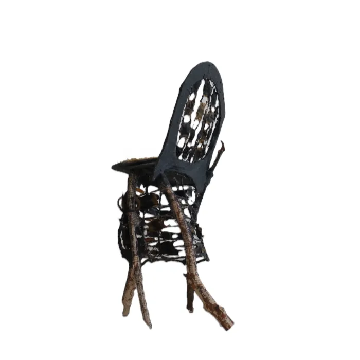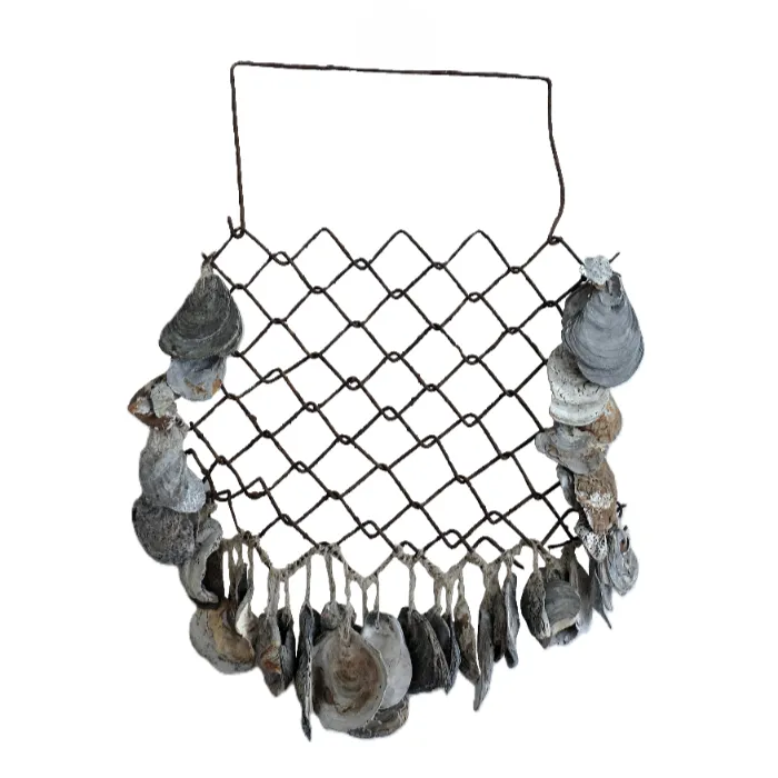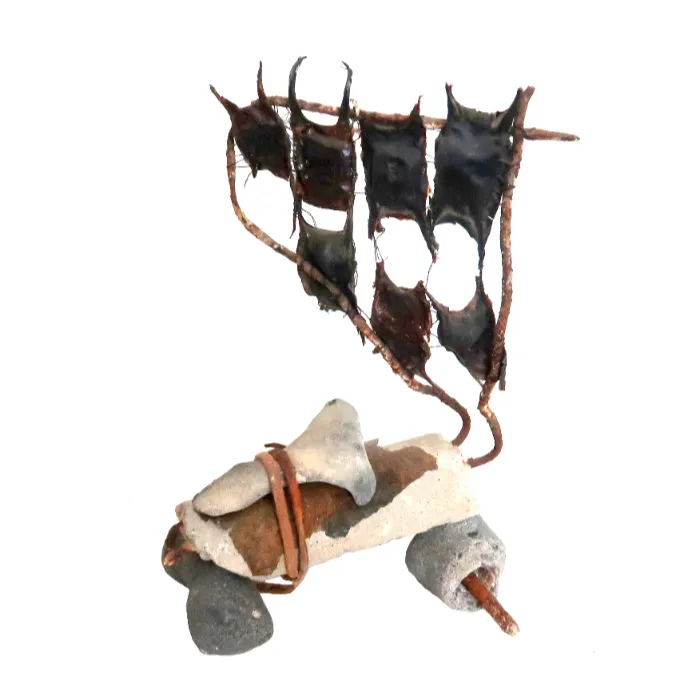 Tien jaar geleden maakte ik mijn eerste driedimensionale objecten met zwarte eikapsels. Ik was in Ault, aan de Normandische kust en ik vervormde stukken aangespoeld geroest metaal en er ontstonden een stoeltje en een windwagen, die ik beide voorzag van die eikapsels door ze aan elkaar te naaien. Dit jaar ontstond weer door toeval een stoel, nu op ware grootte en daar heb ik verschillende soorten eikapsels in verwerkt. Zo werd het een ‘Broedstoel’. De pootjes zijn gemaakt van wilgentakken die door een bever zijn ontdaan van bast. Het lijkt alsof de stoel zo de benen kan nemen, wat een contrast vormt met de eieren die vast zitten en nog uit moeten komen. Dat spreekt tot de verbeelding; denk je in dat je in een onderwater kraamkamer bent en dat voor je ogen uit al die eitjes prachtige zeewezens geboren worden. Van oorsprong komt al het leven uit zee, kun je je dat voorstellen? Terwijl, wat wij vinden aan hetstrand, dat wat aanspoelt meestal dood of kapot is. Ik verzamel het en geef er opnieuw vorm en betekenis aan, dat is mijn passie. Dat doe ik onder het mom van: ‘de zee geeft, het tij keert en keert, mijn hand legt de laatste hand’.