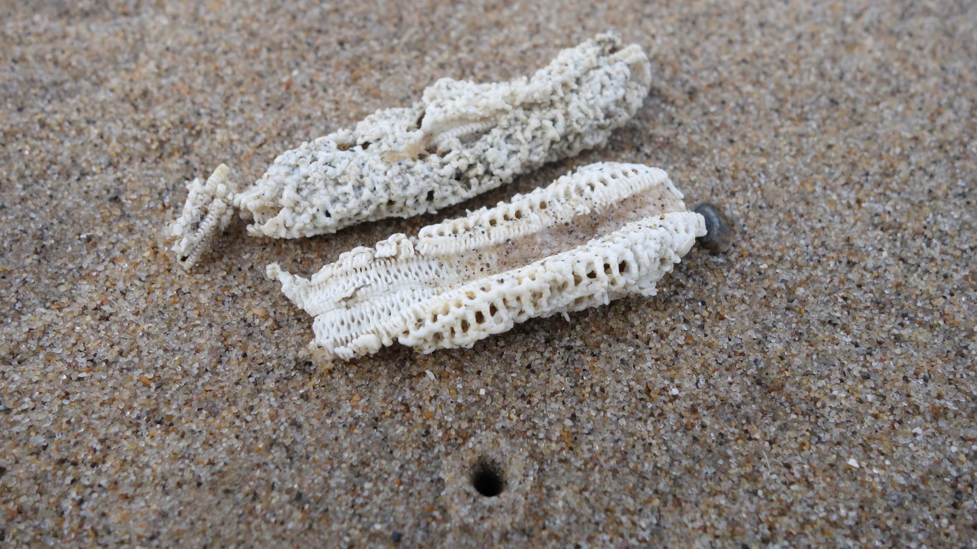 Op het Zuiderstrand kwam mijn liefde voor het strand en de zee weer tot leven. Vooral op de Zandmotor waan je je echt op de Waddeneilanden en kan ik uren rondstruinen; wat een ruimte, leegte en verstilling. En je kunt er van alles vinden. Als je geluk hebt, want sinds een aantal jaren rijden er ook daar vrachtwagens die het strand ‘schoonmaken’. Tot mijn grote frustratie, want naast dingen van de straat pak ik ook dingen uit de vloedlijn op. Iedere keer zijn dat andere dingen. Afhankelijk van het weer, de wind, het seizoen en waar het licht mijn oog op wijst. Ik heb gemerkt dat ik anders kijk dan de meeste mensen. Mijn ogen schieten van grote lijnen, de structuren van eb en vloed in het zand naar kleine details. Naar de schaduwwerking door licht, een stuk versteend bot van een paard van duizenden jaren geleden, eikapsels van sterroggen, hondshaaien of wulken, zeesterren, kwallen, een schelp die overdekt is met witte pokken of het licht dat door een dunwandige blauwe mosselschelp schijnt. En dat licht, al die details leg ik vast. Ik fotografeer heel wat af.